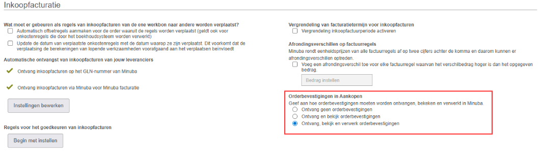 Naast de keuze om ze te ontvangen, kun je ook bepalen of je medewerkers ze mogen verwerken. Dit kan handig zijn om sneller een overzicht te krijgen van wat er voor een order is besteld, nog voordat de inkoopfactuur binnenkomt.