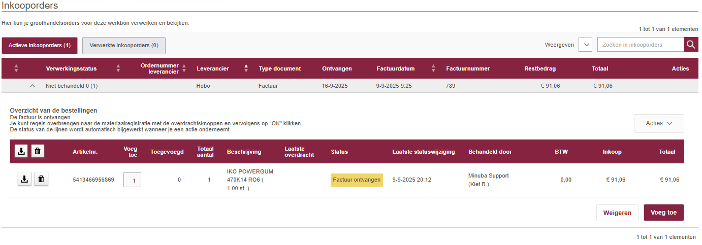 Wanneer de groothandel vervolgens een orderbevestiging, pakbon of factuur naar Minuba stuurt, worden de bestellingen en de bijbehorende regels weergegeven in de sectie Groothandelsinkoop, waar je ze kunt overzetten naar de materiaalregistratie.