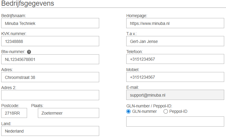 Klantnaam, vestigingsplaats en GLN-nummer/PEPPOL-id moeten ingevuld worden op de Bedrijfsinstellingen pagina.