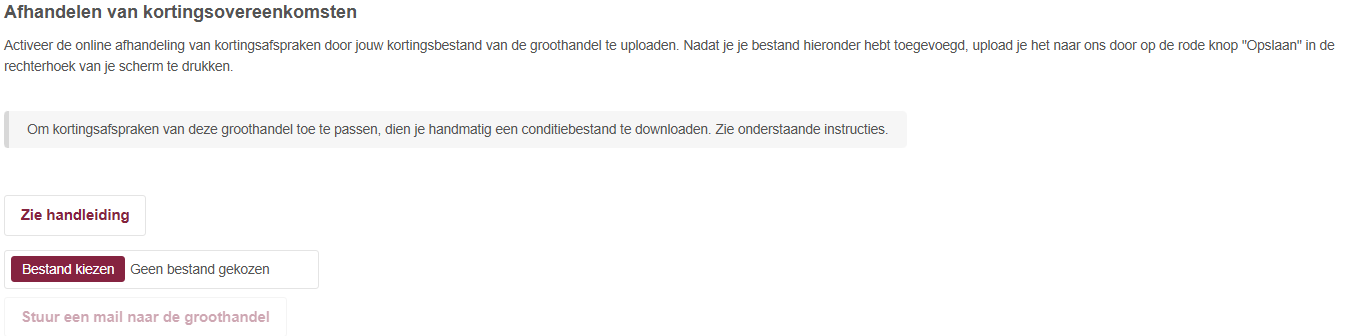 - Hier kan de kortingsovereenkomsten afhandelen, door de groothandel te mailen. Let op dat je eerst de groothandel toevoegt, als je dat gedaan hebt kan je op de knop ´stuur een mail naar de groothandel´selecteren.