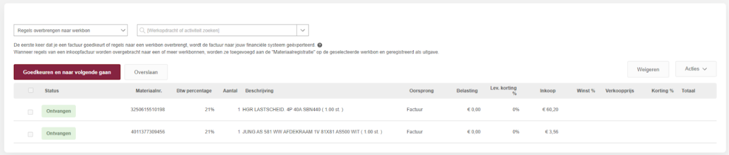 Zodra je het gewenste materiaal en aantal hebt gekozen, klik je op ‘Zet over naar geselecteerde werkbon’. De regels worden dan gekoppeld aan de gekozen werkbon.