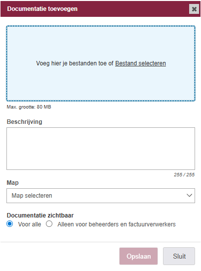 Het is mogelijk om documentatie (bijv. een foto of PDF) te beperken zodat deze alleen zichtbaar is voor gebruikers met de rol Administrator of Facturatie.