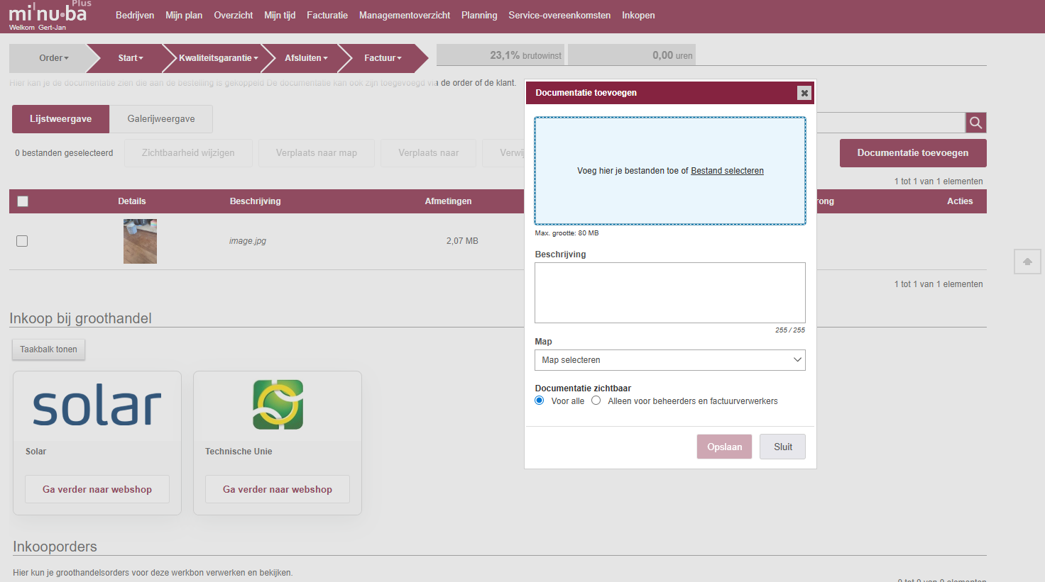 Onder het kopje ‘documentatie’ heb je een overzicht van documenten, tekeningen, foto’s enz. die op de zaak zijn opgeslagen. Hier zie je ook de mappenstructuur als er mappen zijn gemaakt voor verschillende documenten.